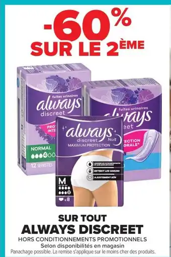 L'offre est disponible dans plusieurs magasins, vérifiez tous les produits pour obtenir le ALWAYS DISCREET le moins cher. Si vous souhaitez savoir si l'article est en vente avec une plus grosse remise dans un autre magasin, consultez la catégorie 'Supermarché'. Ces offres pourraient aussi vous intéresser : ALWAYS DISCREET, Sur tout always discreet & SUR LE 2ÈME AU CHOIX SUR LA GAMME HYGIÈNE FÉMININE always discreet.