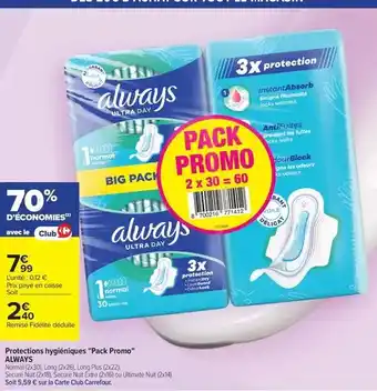 Actuellement en offre chez Carrefour Drive : Always - protections hygiéniques pack promo ✅ Valable du 6-01 au 19-01.