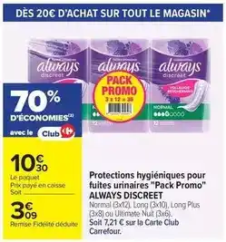 Offre Always - protections hygiéniques pour fuites urinaires pack promo chez Carrefour Drive