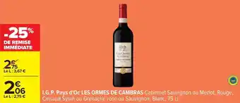 Offre Cambras - i.g.p. pays d'oc les ormes de cabernet sauvignon ou merlot. rouge chez Carrefour Drive