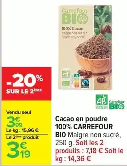 En plus de l'offre Carrefour - cacao en poudre 100%, Carrefour Drive propose une large gamme de produits. Consultez le Catalogue Carrefour Drive hebdomadaire pour découvrir les meilleures offres et promotions. En plus de Carrefour - cacao en poudre 100%, il y a aussi : Carrefour bio cacao en poudre 100%, Top budget préparation au cacao maigre en poudre & Carrefour classic' chocolat en poudre.