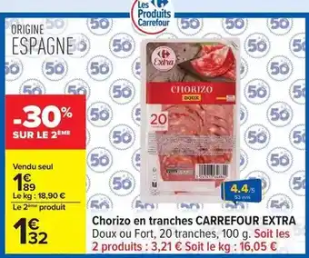 En plus de l'offre Carrefour - chorizo en tranches extra, Carrefour Drive propose une large gamme de produits. Consultez le Catalogue Carrefour Drive hebdomadaire pour découvrir les meilleures offres et promotions. En plus de Carrefour - chorizo en tranches extra, il y a aussi : CARREFOUR EXTRA Chorizo en tranches, Chorizo extra doux filiere qualite carrefour & Viande de boeuf séchée CARREFOUR EXTRA 12 tranches.