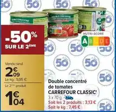 L'offre est disponible dans plusieurs magasins, vérifiez tous les produits pour obtenir le Carrefour classic - double concentré de tomates le moins cher. Si vous souhaitez savoir si l'article est en vente avec une plus grosse remise dans un autre magasin, consultez la catégorie 'Supermarché'. Ces offres pourraient aussi vous intéresser : CARREFOUR CLASSIC Double concentré de tomates, Carrefour classic' double concentré de tomates & Carrefour - classic double concentré de tomates.