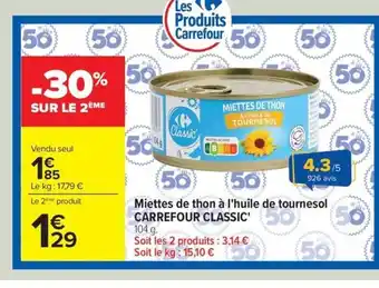 Actuellement en offre chez Carrefour Drive : CARREFOUR CLASSIC Miettes de thon à l'huile de tournesol ✅ Valable du 28-04 au 11-05.