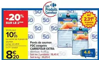 Carrefour - pavés de saumon foc congelés bénéficie actuellement d'une réduction chez Carrefour Drive. Vous trouverez ici toutes les infos utiles sur les prix, la durée de validité et les conditions de l’offre. Pensez à consulter aussi d'autres offres et promotions similaires pour Carrefour - pavés de saumon foc congelés afin d’acheter toujours au bon prix. La promo Carrefour - pavés de saumon foc congelés est valable du 22-01-2026 au 09-02-2026. Offre terminée ? Pas de souci. D'autres offres sur ces produits sont peut-être déjà disponibles. Vous pouvez suivre cette catégorie de produits pour rester informé en cas de nouvelle promotion Carrefour - pavés de saumon foc congelés chez Carrefour Drive. En comparant les offres, vous êtes sûr d’acheter au prix le plus bas possible.Questions fréquemment posées au sujet de Carrefour - pavés de saumon foc congelés