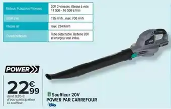 Carrefour - souffleur 20v bénéficie actuellement d'une réduction chez Carrefour Drive. Vous trouverez ici toutes les infos utiles sur les prix, la durée de validité et les conditions de l’offre. Pensez à consulter aussi d'autres offres et promotions similaires pour Carrefour - souffleur 20v afin d’acheter toujours au bon prix. La promo Carrefour - souffleur 20v est valable du 20-02-2026 au 09-03-2026. Offre terminée ? Pas de souci. D'autres offres sur ces produits sont peut-être déjà disponibles. Vous pouvez suivre cette catégorie de produits pour rester informé en cas de nouvelle promotion Carrefour - souffleur 20v chez Carrefour Drive. En comparant les offres, vous êtes sûr d’acheter au prix le plus bas possible.Questions fréquemment posées au sujet de Carrefour - souffleur 20v