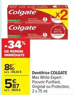 Actuellement en offre chez Carrefour Drive : Colgate - dentifrice max white expert: pouvoir purifiant, original ou protection ✅ Valable du 17-02 au 2-03.