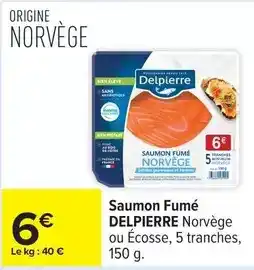 Actuellement en offre chez Carrefour Drive : Delpierre - saumon fumé norvège ou écosse, 5 tranches ✅ Valable du 10-03 au 23-03.
