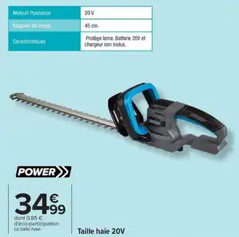 Le prix de l'offre Taille haie 20v se trouve également en haut de la page, ainsi que la date à laquelle l'offre est disponible. Vous pouvez également vérifier les prix dans le Catalogue Carrefour Drive actuel ou sur le site Internet de Carrefour Drive. Les offres vous permettent d'acheter les produits Carrefour Drive au prix le plus bas.
