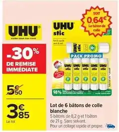 Offre Uhu - lot de 6 bâtons de colle blanche chez Carrefour Drive