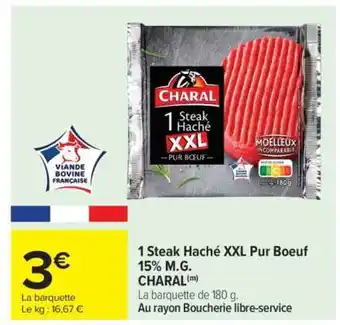 Actuellement en offre chez Carrefour Market : 1 Steak Haché XXL Pur Boeuf 15% M.G. CHARAL ✅ Valable du 20-01 au 2-02.