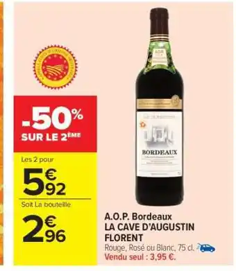 Actuellement en offre chez Carrefour Market : A.O.P. Bordeaux LA CAVE D'AUGUSTIN FLORENT ✅ Valable du 24-02 au 8-03.