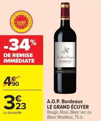 Actuellement en offre chez Carrefour Market : A.o.p. bordeaux le grand écuyer ✅ Valable du 21-04 au 3-05.