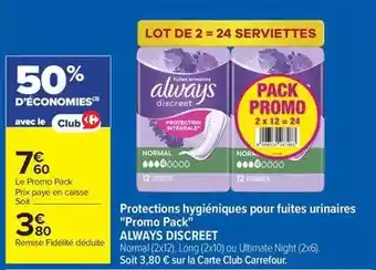 Always - protections hygiéniques pour fuites urinaires promo pack discreet offres et promotions en ligne chez Carrefour Market