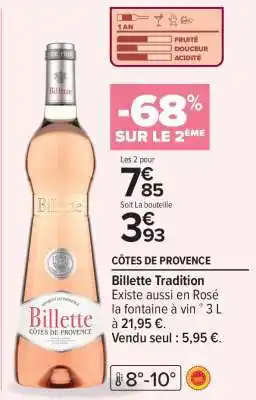 En plus de l'offre Billette Tradition, Carrefour Market propose une large gamme de produits. Consultez le Catalogue Carrefour Market hebdomadaire pour découvrir les meilleures offres et promotions. En plus de Billette Tradition, il y a aussi : Côtes de provence billette tradition, Rosé tradition & ARCHE DE JARDIN TRADITION.