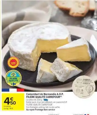 En plus de l'offre Camembert de Normandie A.O.P. FILIÈRE QUALITÉ CARREFOUR, Carrefour Market propose une large gamme de produits. Consultez le Catalogue Carrefour Market hebdomadaire pour découvrir les meilleures offres et promotions. En plus de Camembert de Normandie A.O.P. FILIÈRE QUALITÉ CARREFOUR, il y a aussi : Carrefour - camembert de normandie a.o.p. filière qualité, Filiere qualite carf cantal entre-deux a.o.p. filière qualité carrefour & Filiere qualite carf carotte filière qualité carrefour.
