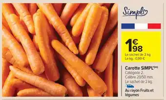 En plus de l'offre Carotte SIMPL', Carrefour Market propose une large gamme de produits. Consultez le Catalogue Carrefour Market hebdomadaire pour découvrir les meilleures offres et promotions. En plus de Carotte SIMPL', il y a aussi : Simpl carotte simpl', SIMPL' Carotte & Carotte.