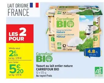 CARREFOUR BIO Yaourt au lait entier nature 12 x 125 g