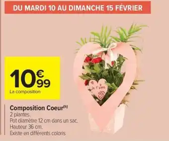 En plus de l'offre Composition coeur, Carrefour Market propose une large gamme de produits. Consultez le Catalogue Carrefour Market hebdomadaire pour découvrir les meilleures offres et promotions. En plus de Composition coeur, il y a aussi : Composition de 9 pivoines, Composition de 5 chrysanthèmes & Composition tendresse.
