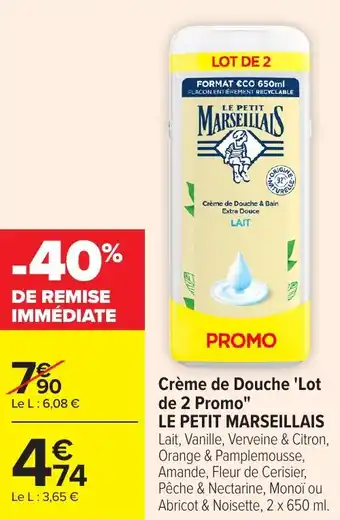 Crème de douche lot de 2 promo le petit marseillais offres et promotions en ligne chez Carrefour Market