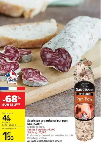 Actuellement en offre chez Carrefour Market : DEBROAS Saucisson sec artisanal pur porc ✅ Valable du 27-01 au 8-02.