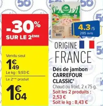 En plus de l'offre Dés de jambon carrefour classic', Carrefour Market propose une large gamme de produits. Consultez le Catalogue Carrefour Market hebdomadaire pour découvrir les meilleures offres et promotions. En plus de Dés de jambon carrefour classic', il y a aussi : Carrefour classic' dés de jambon, CARREFOUR CLASSIC Jambon Le Paris & Jambon de Paris CARREFOUR CLASSIC.