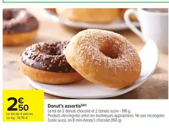 En plus de l'offre Donut's assortis, Carrefour Market propose une large gamme de produits. Consultez le Catalogue Carrefour Market hebdomadaire pour découvrir les meilleures offres et promotions. En plus de Donut's assortis, il y a aussi : Éclairs assortis, Persil - poêlée cuisinée de légumes assortis & VICO Chips Curly donut's Format XL.