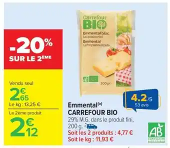 Actuellement en offre chez Carrefour Market : Emmental CARREFOUR BIO ✅ Valable du 24-02 au 8-03.