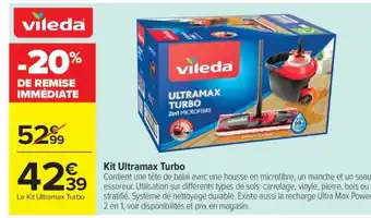 L'offre est disponible dans plusieurs magasins, vérifiez tous les produits pour obtenir le Kit Ultramax Turbo le moins cher. Si vous souhaitez savoir si l'article est en vente avec une plus grosse remise dans un autre magasin, consultez la catégorie 'Supermarché'. Ces offres pourraient aussi vous intéresser : Kit Ultramax Turbo, Vileda - kit ultramax turbo & Vileda kit ultramax turbo.