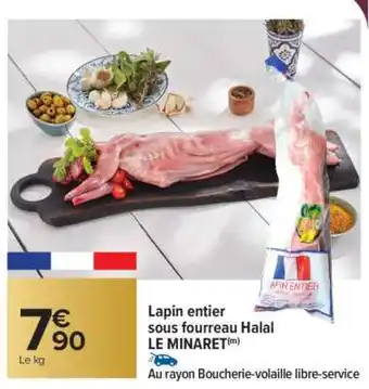 Actuellement en offre chez Carrefour Market : Lapin entier sous fourreau Halal LE MINARET ✅ Valable du 27-01 au 15-02.