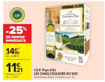 En plus de l'offre LES CHAIS COULEURS DU SUD, Carrefour Market propose une large gamme de produits. Consultez le Catalogue Carrefour Market hebdomadaire pour découvrir les meilleures offres et promotions. En plus de LES CHAIS COULEURS DU SUD, il y a aussi : Les chais couleurs du sud i.g.p. pays d'oc, MÉMO - ODEURS ET COULEURS & Stylo 4 couleurs "om".