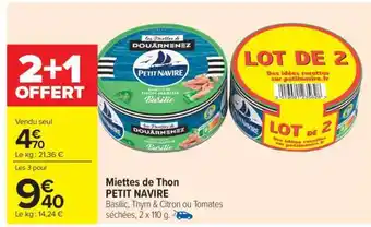 Actuellement en offre chez Carrefour Market : Miettes de thon PETIT NAVIRE ✅ Valable du 24-02 au 8-03.