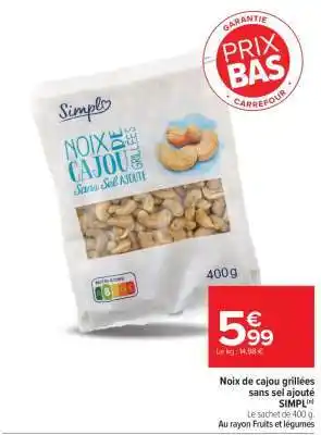 Noix de cajou grillées sans sel ajouté SIMPL offres et promotions en ligne chez Carrefour Market