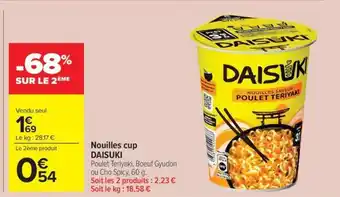 Le prix de l'offre Nouilles cup daisuki se trouve également en haut de la page, ainsi que la date à laquelle l'offre est disponible. Vous pouvez également vérifier les prix dans le Catalogue Carrefour Market actuel ou sur le site Internet de Carrefour Market. Les offres vous permettent d'acheter les produits Carrefour Market au prix le plus bas.