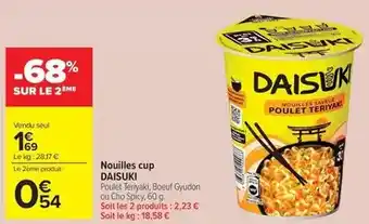 L'offre est disponible dans plusieurs magasins, vérifiez tous les produits pour obtenir le Nouilles cup le moins cher. Si vous souhaitez savoir si l'article est en vente avec une plus grosse remise dans un autre magasin, consultez la catégorie 'Supermarché'. Ces offres pourraient aussi vous intéresser : Nouilles cup daisuki, Nouilles cup DAISUKI & Daisuki nouilles cup.