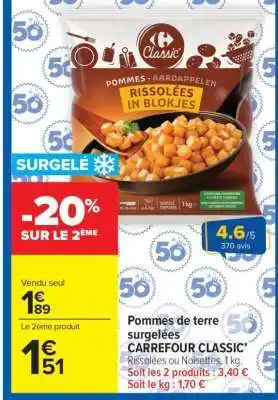 L'offre est disponible dans plusieurs magasins, vérifiez tous les produits pour obtenir le Pommes de terre surgelées CARREFOUR CLASSIC’ le moins cher. Si vous souhaitez savoir si l'article est en vente avec une plus grosse remise dans un autre magasin, consultez la catégorie 'Supermarché'. Ces offres pourraient aussi vous intéresser : Carrefour classic' pommes de terre surgelées, Pommes de surgelées carrefour classic & Pommes de terre surgelées.
