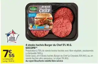 Actuellement en offre chez Carrefour Market : Socopa - 4 steaks hachés burger du chef 5% m.g ✅ Valable du 31-03 au 12-04.