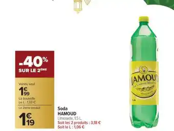 Actuellement, Soda HAMOUD est en promotion chez Carrefour Market. Toutes les informations utiles comme le prix, les conditions et la durée de validité sont affichées sur cette page. Consultez également les promotions similaires pour Soda HAMOUD, afin de faire le meilleur choix. La promo Soda HAMOUD est valable du 27-01-2026 au 15-02-2026. Si elle est expirée, regardez les autres offres équivalentes. Vous pouvez aussi suivre cette catégorie de produit pour être alerté lorsqu’une nouvelle promotion Soda HAMOUD apparaît chez Carrefour Market.Questions fréquemment posées au sujet de Soda HAMOUD