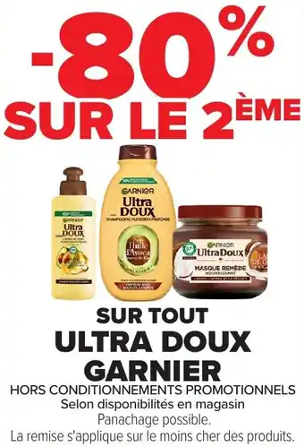 L'offre est disponible dans plusieurs magasins, vérifiez tous les produits pour obtenir le Sur tout ultra doux garnier le moins cher. Si vous souhaitez savoir si l'article est en vente avec une plus grosse remise dans un autre magasin, consultez la catégorie 'Supermarché'. Ces offres pourraient aussi vous intéresser : SHAMPOOING “ULTRA DOUX GARNIER”, Garnier routine capillaire ultra doux & Garnier - masque capillaire ultra doux.