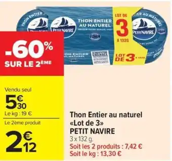 En plus de l'offre Thon entier au naturel lot de 3 petit navire, Carrefour Market propose une large gamme de produits. Consultez le Catalogue Carrefour Market hebdomadaire pour découvrir les meilleures offres et promotions. En plus de Thon entier au naturel lot de 3 petit navire, il y a aussi : Petit navire - thon entier au naturel lot de 3, Petit navire - thon entier au naturel & PETIT NAVIRE Thon entier au naturel.