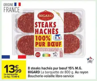 Offre 8 steaks hachés pur bœuf 15% M.G. BIGARD chez Carrefour