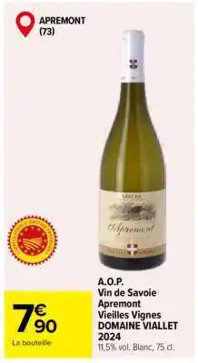 Actuellement en offre chez Carrefour : A.O.P. Vin de Savoie Apremont Vieilles Vignes DOMAINE VIALLET 2024 ✅ Valable du 20-02 au 9-03.