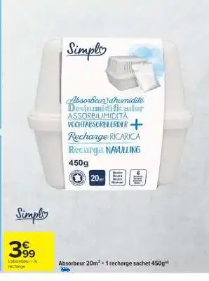 L'offre est disponible dans plusieurs magasins, vérifiez tous les produits pour obtenir le Absorbeur 20m² + 1 recharge sachet 450g le moins cher. Si vous souhaitez savoir si l'article est en vente avec une plus grosse remise dans un autre magasin, consultez la catégorie 'Supermarché'. Ces offres pourraient aussi vous intéresser : Absorbeur 20m² + 1 recharge sachet, Simpl absorbeur 20m² + 1 recharge sachet 450g & Simply - absorbeur 20m² + 1 recharge sachet 450g.