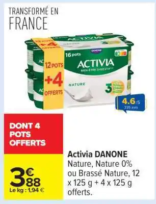 En plus de l'offre Activia Danone, Carrefour propose une large gamme de produits. Consultez le Catalogue Carrefour hebdomadaire pour découvrir les meilleures offres et promotions. En plus de Activia Danone, il y a aussi : Danone activia offre découverte, Danone - activia offre découverte & DANONE Activia Prix Choc.