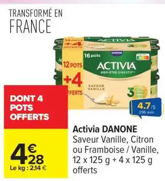 Actuellement, Activia Danone est en promotion chez Carrefour. Toutes les informations utiles comme le prix, les conditions et la durée de validité sont affichées sur cette page. Consultez également les promotions similaires pour Activia Danone, afin de faire le meilleur choix. La promo Activia Danone est valable du 03-03-2026 au 16-03-2026. Si elle est expirée, regardez les autres offres équivalentes. Vous pouvez aussi suivre cette catégorie de produit pour être alerté lorsqu’une nouvelle promotion Activia Danone apparaît chez Carrefour.Questions fréquemment posées au sujet de Activia Danone