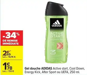 Actuellement en offre chez Carrefour : Adidas - gel douche active start, cool down, energy kick, after sport ou uefa ✅ Valable du 17-02 au 2-03.