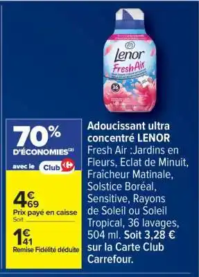Actuellement, Adoucissant ultra concentré LENOR Fresh Air est en promotion chez Carrefour. Toutes les informations utiles comme le prix, les conditions et la durée de validité sont affichées sur cette page. Consultez également les promotions similaires pour Adoucissant ultra concentré LENOR Fresh Air, afin de faire le meilleur choix. La promo Adoucissant ultra concentré LENOR Fresh Air est valable du 24-02-2026 au 09-03-2026. Si elle est expirée, regardez les autres offres équivalentes. Vous pouvez aussi suivre cette catégorie de produit pour être alerté lorsqu’une nouvelle promotion Adoucissant ultra concentré LENOR Fresh Air apparaît chez Carrefour.Questions fréquemment posées au sujet de Adoucissant ultra concentré LENOR Fresh Air