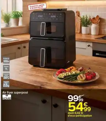 L'offre est disponible dans plusieurs magasins, vérifiez tous les produits pour obtenir le Air fryer superposé le moins cher. Si vous souhaitez savoir si l'article est en vente avec une plus grosse remise dans un autre magasin, consultez la catégorie 'Supermarché'. Ces offres pourraient aussi vous intéresser : Air fryer superposé, Air fryer superposé & Carrefour home air fryer superposé.