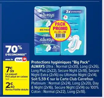 ALWAYS Protections hygiéniques Big Pack offres et promotions en ligne chez Carrefour