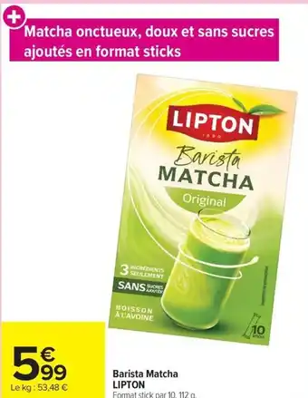 En plus de l'offre Barista Matcha LIPTON, Carrefour propose une large gamme de produits. Consultez le Catalogue Carrefour hebdomadaire pour découvrir les meilleures offres et promotions. En plus de Barista Matcha LIPTON, il y a aussi : MATCHA BARISTA AVOINE LIPTON, Matcha barista avoine lipton & Matcha barista avoine lipton.
